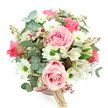 Bring sophistication and charm to your event with our round flower arrangement. Featuring an elegant mix of pink roses, white chrysanthemums, white alstroemeria, and lush greenery, this bouquet is meticulously designed to elevate any setting.