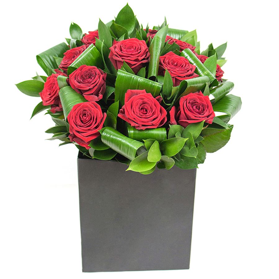 Discover refinement with our beautiful bouquet, featuring vibrant red roses, lush aspidistra leaves, and delicate ruscus. Each flower is hand-selected to ensure the highest level of freshness and quality.